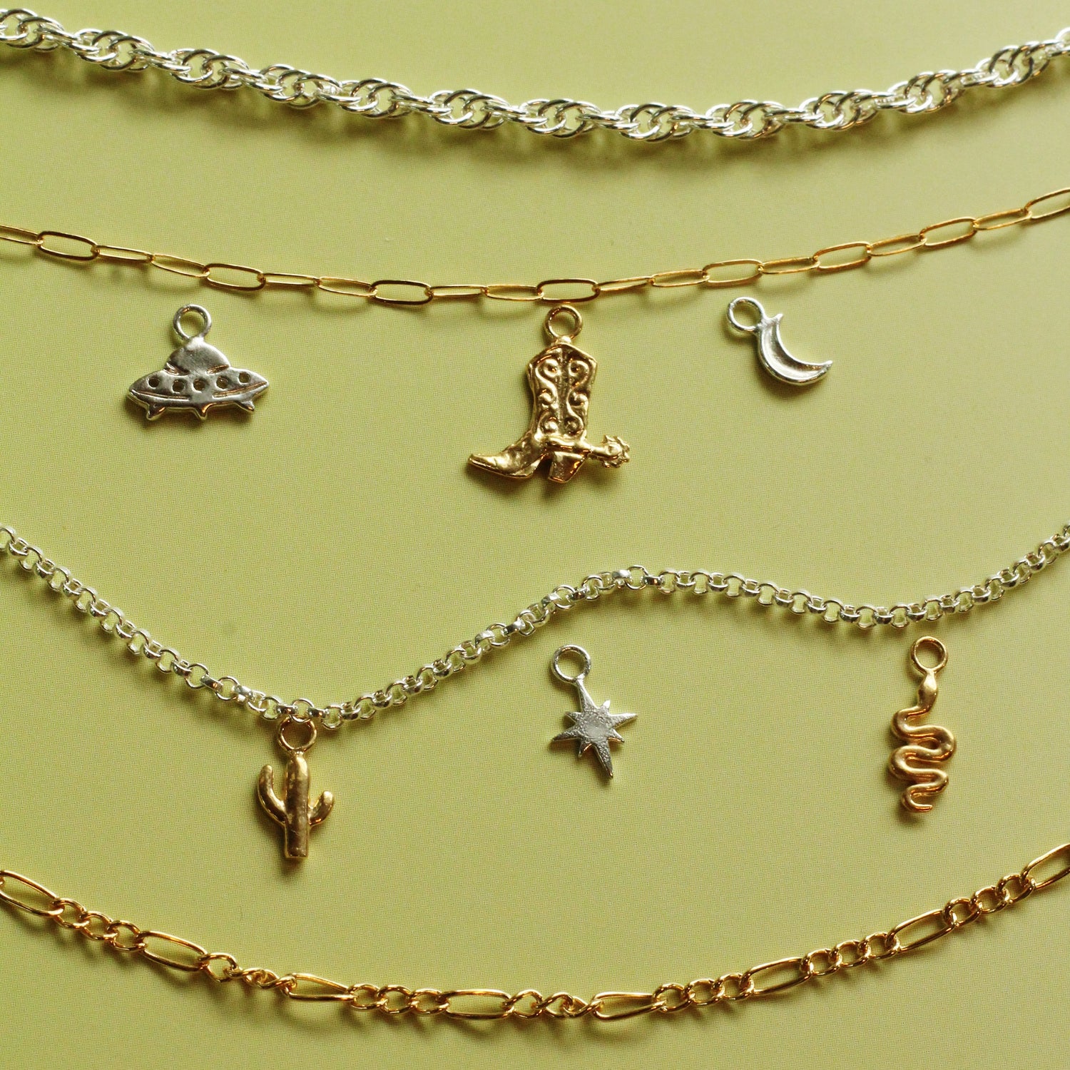 Stop by one of our pop up events and design your perfect custom bracelet, anklet, ring or necklace. Select from a range of chain options and delve into our collection of handcrafted charms inspired by the Wild West. Choose to have your custom piece permanently welded on or add a clasp to easily take your piece on and off.